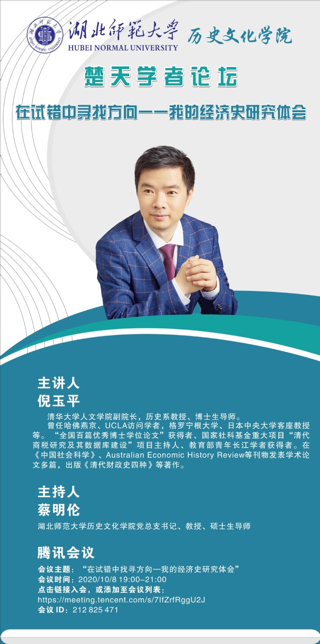 10月8日晚,一场主题为“在试错中寻找方向——我的经济史研究体会”的线上讲座利用腾讯会议平台召开。主讲人清华大学人文学院副院长、博士生导师倪玉平教授从切身经历出发为麻豆社 研究生开展一场别开生面的“云”讲座。本次讲座由麻豆社 党总支书记蔡明伦教授主持,麻豆社 副院长李柏林教授、学科带头人张泰山教授等多位老师和全体研究生参加。