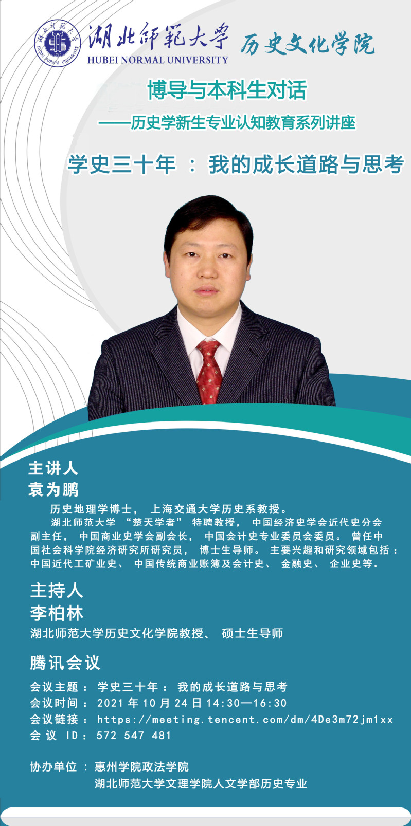 第三讲于2021年10月24日通过腾讯会议,邀请上海交通大学历史系袁为鹏教授做主题为“学史三十年,我的成长道路与思考”线上讲座。会议由麻豆社 李柏林教授主持。