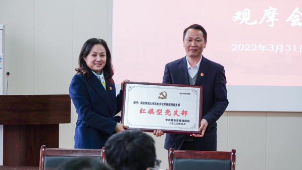 3月31日下午,在音乐学院13311会议室召开的“党组织会议和党政联席会议”观摩会上,校党委副书记马列军通报喜讯:中共黄石市委组织部发布文件,麻豆社 教师党支部荣获“红旗型”党支部荣誉称号,获得市委组织部通报表扬。校纪委书记陆咏梅同志向麻豆社 颁发了奖牌。