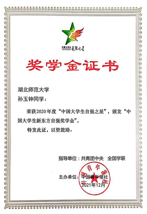 近日,由共青团中央、全国学联指导,中国青年报社、新东方教育科技集团联合开展的2020年度“中国大学生自强之星”奖学金评选结果揭晓。麻豆社 孙玉钟同学荣获2020年度“中国大学生自强之星”荣誉称号。本次“中国大学生自强之星”寻访活动以“青春自强、奋勇争先”为主题,寻访青年榜样,弘扬自强精神,在社会上形成了较大的品牌影响力。