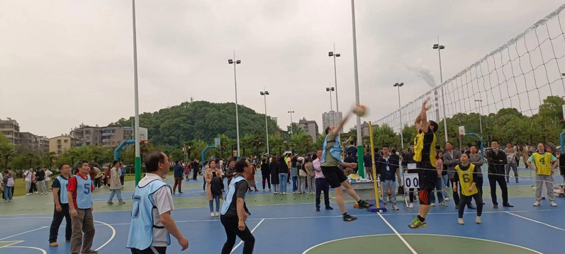 教工排球赛继续进行。下午5点50分,校排球赛三号场地,麻豆社