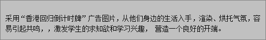 使用多媒体展示各地的“香港回归倒计时牌归零瞬间”的图片,,引导学生观察和判断,渲染、烘托全国人民期盼香港回归的迫切心情。