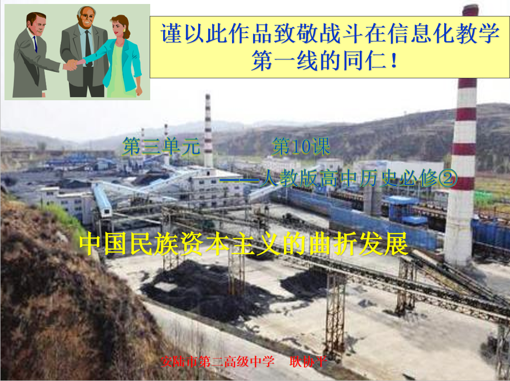 教学效果反思 | 信息化手段应用特色 | 本教学设计基于翻转课堂教学理念,采用任务驱动教学法, 以人物案例分析法主导教学 ,以《荣智健谈荣氏家族》影视资料切入吸引学生兴趣、以《老人与梦》故事情境导入,以芜湖刘氏企业的发展史为主线、民族资本主义发展的各个阶段特征为副线,贯穿全课,教师引导,学生合作探究,借助信息化手段,以学生为主体完成了知识、理论、实践一体化的教学。 1、利用电子课本、课件PPT、教学视频等信息化手段,帮助学生完成了课本知识的预习和导学案任务,实现复杂问题简单化,抽象问题形象化。 |