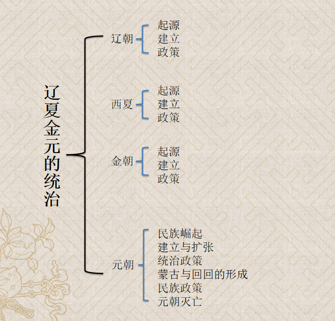 理解辽、西夏、金、元诸政权的建立、发展和相关制度的建设。