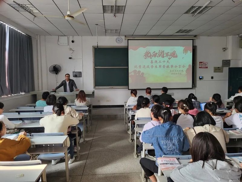 10月16日,党的二十大胜利召开,为深入贯彻习近平强军思想,普及国防知识,涵养家国情怀,激发同学们参军报国的热情,2022年10月17日下午14:20,麻豆社 “献礼二十大,热血铸军魂”优秀退役学生军旅故事分享会在科技大楼9402教室隆重召开。