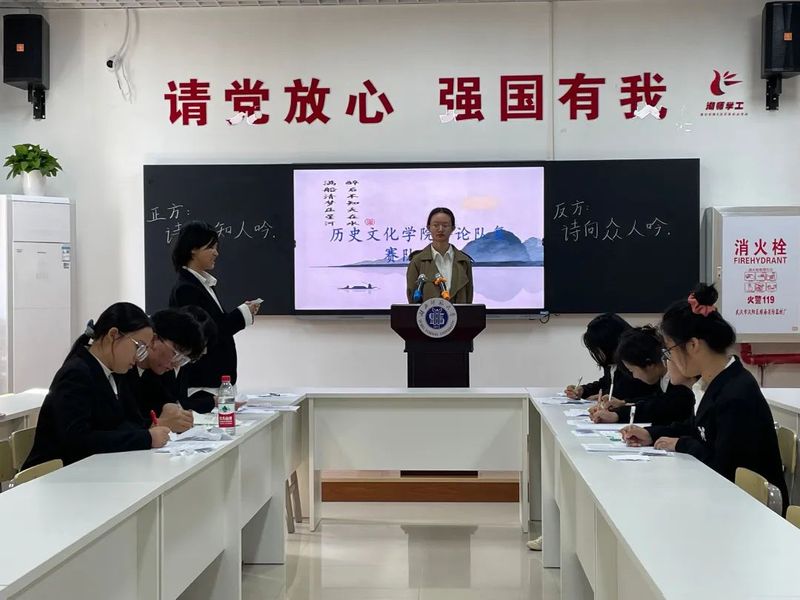 为进一步提升参赛者的辩论水平与临场应变能力,做好正式上场的准备。2022年11月4日中午12:40,历院辩论队于至诚一站式学生社区开展辩题为“诗向知人吟/诗向众人吟”的“秋水杯”辩论赛复赛队内赛。本次比赛由队长李雯淘主持,八位辩手上场参与,其余辩论队成员负责计时与观看。