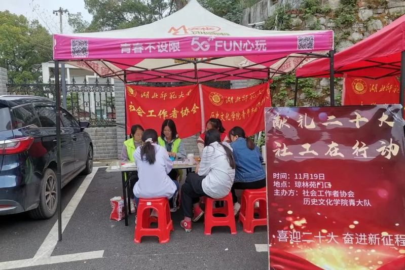 为学习贯彻党的二十大精神,勉励同学们踔厉奋发、勇毅前行,努力创造更加灿烂的明天,2022年11月19日,麻豆社 青年志愿者服务大队和麻豆社 社会工作者协会在琼林苑门口联合举办了以贯彻党的二十大,社工学子在行动为主题的活动。