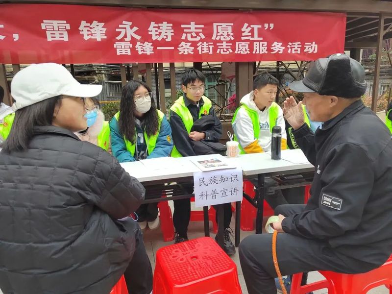 8时,志愿者们到达南岳社区进行摆点。8时30分,志愿服务活动正式开始。此次志愿服务活动分为“资料讲解”、“视频宣传”、“知识问答”三个部分。志愿者们积极动员、广泛宣传,在整个志愿服务活动中充分发挥自身作用,帮助参与者学习国家民族政策,树立正确民族观念。历经四个小时,志愿服务活动于中午12时30分圆满结束。