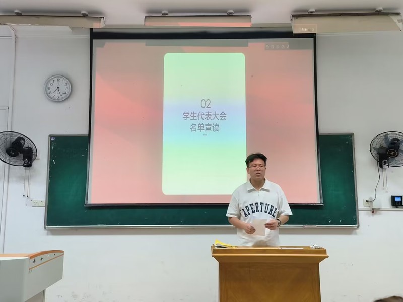会议第二项,辅导员康博仁老师宣读学生代表大会名单并承诺学生代表选举是在以“公平公开公正”上为基础进行的,有问题可以向院里咨询。
