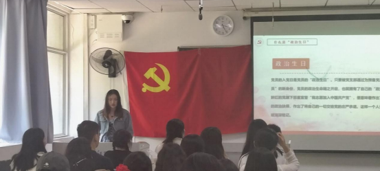在自选动作环节,2102班徐欣彤则从学习贯彻习近平总书记为第六批全国干部学习培训教材作《序言》和为党员过“政治生日”两个方面进行讲述。她首先对《序言》进行了简单的介绍,将习近平总书记对基层党支部要把《序言》作为重要学习内容,贯彻落实《序言》精神,学用贯通、知行合一的希望展现给大家,“道不可坐论,理不能空谈”,要巩固拓展主题教育成果,坚持不懈用新时代中国特色社会主义思想凝心铸魂,真正把马克思主义看家本领学到手,以思想高度统一确保政治统一、行动统一,全面提升与推进中国式现代化相适应的政治能力、领导能力、工作能力。要善于从党的创新理论中汲取踔厉奋发、勇毅前行的精神动力,坚定历史自信、锤炼斗争本领,始终以锐意进取、迎难而上的奋斗姿态奋进新征程、建功新时代。作为新时代青年党员,我们应加强对于党的各大决议、重要会议、实干政策的学习;加强自我反思,时刻警醒自己;在学习习近平总书记《序言》和第六批全国干部学习培训教材中坚持读原著、学原文、悟原理,以“凿深井”的功夫学出坚定信念、对党忠诚、为民情怀、过硬本领、优良作风,树立和践行正确的权力观、政绩观、事业观,将深厚的理论素养内化为想干事的实践动力。
