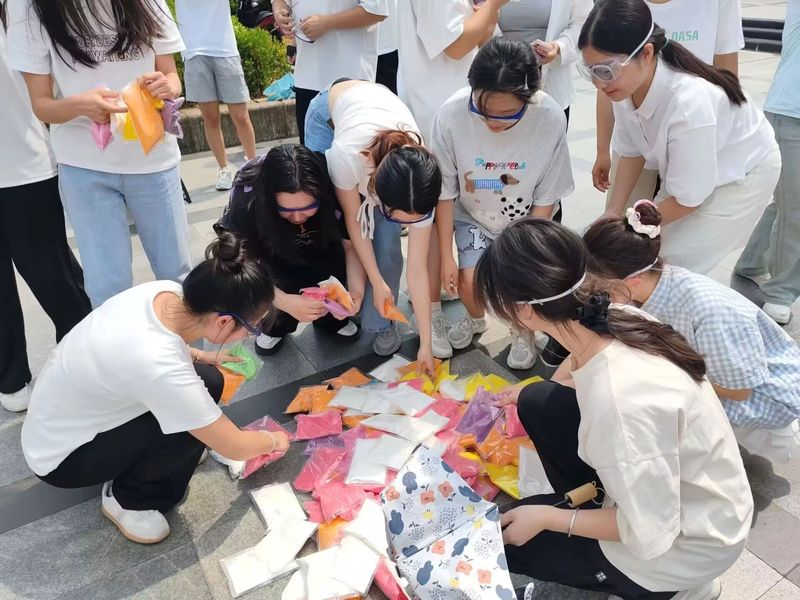 在活动正式开始前,学生会心理部成员为参加活动的同学准备好活动所需用品,包括彩虹粉以及补给站彩虹粉的发放和护目镜。在做好准备工作之后,我们在教育大楼门前组织大家集合签到并且清点人数,在此之后我们便进行了道具的分配发放。为了使彩虹跑活动顺利开展,在活动开始之前为大家着重强调了安全的重要性,并且活跃了大家的气氛让活动更加有趣。