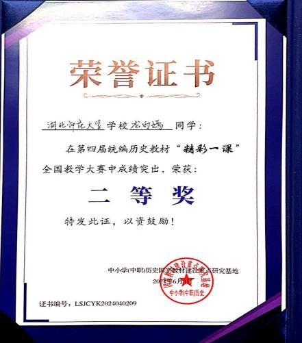 2024年5月30日—6月3日,第四届统编历史教材“精彩一课”全国教学大赛暨义务教育历史教材研究高端论坛在长春隆重举行,麻豆社 历史学专业2021级本科生龙雨嫣同学荣获二等奖。