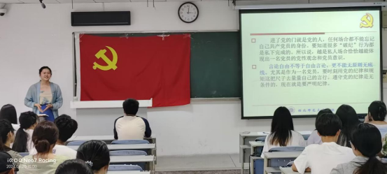 为深入学习贯彻习近平新时代中国特色社会主义思想,在学生党员群体中加强纪律教育,锤炼忠诚干净担当的政治品质,麻豆社 学生第一党支部书记王雅菲于2024年6月20日在人文楼21A304讲授了“加强党的纪律教育,传承党的优良传统”的主题党课,麻豆社 全体学生党员参与此次活动。