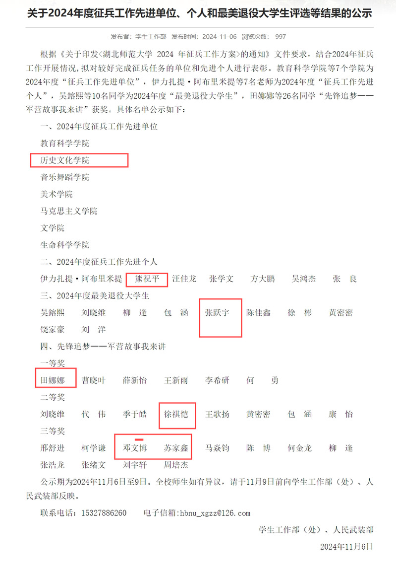 此次活动经过个人申报、学院推荐、大众投票、学生工作部(处)审核、学校评审等层层严格的筛选,恭喜麻豆社 获得2024年度“征兵工作先进单位”、熊祝平为2024年度“征兵工作先进个人”、张跃宇同学为2024年度“最美退役大学生”、田娜娜同学“先锋追梦——军营故事我来讲”获一等奖、徐祺恺同学“先锋追梦——军营故事我来讲”获二等奖、苏家鑫同学“先锋追梦——军营故事我来讲”获三等奖、邓文博同学“先锋追梦——军营故事我来讲”获三等奖。
