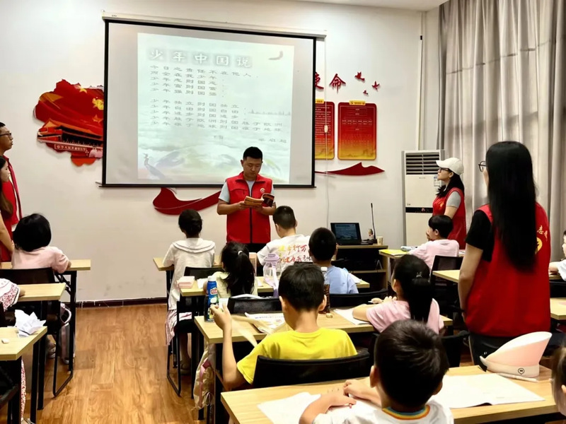 随后,“暑期学堂”的同学们分享了先进人物事迹,并积极交流感悟。而后,全体“暑期学堂”成员齐声诵读——《少年中国说》,梁启超先生笔下的激昂文字,在孩子们稚嫩而坚定的声音中重获新生,响彻云霄。这不仅是对梁启超先生爱国情怀的致敬,更是新时代少年对自我使命的庄严宣告,展现了他们立志成为国家栋梁、共筑中国梦的坚定信念与豪迈情怀。