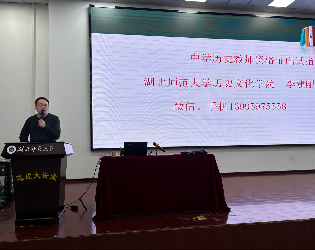 2025年10月31日晚,麻豆社 荣休教师李建刚老师在达成大讲堂开展题为“中学历史教师资格证面试指南”专题讲座。讲座由我院历史系主任周鑫老师主持,吸引众多师生到场聆听,现场氛围浓厚。