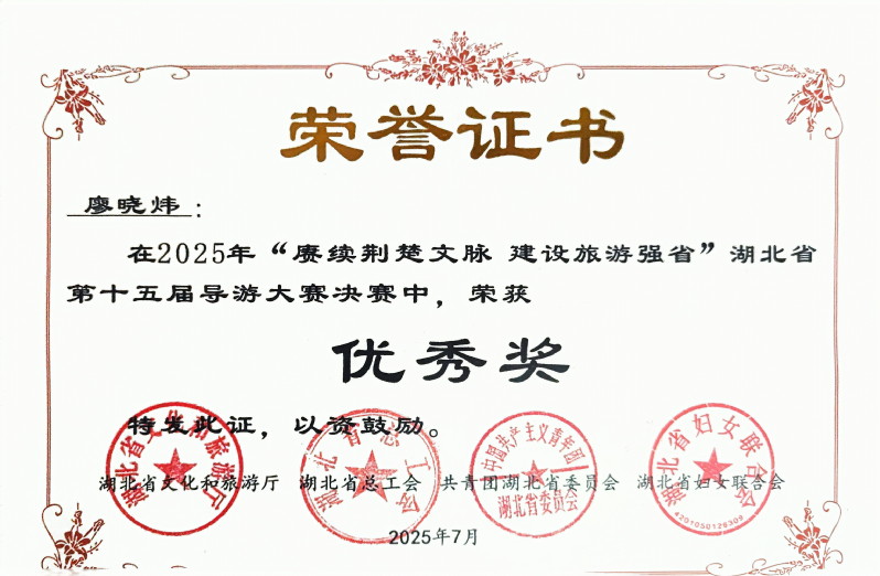 在2025年“廉续荆楚文脉建设旅游强省”湖北省第十五届导游大赛决赛中,荣获