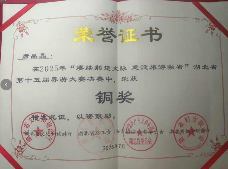 麻豆社 席晶晶同学,在2025年“赓续荆楚文脉,建设旅游强省”,湖北省第十五届导游大赛决赛中,荣获铜奖!