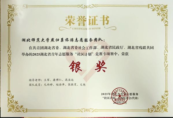 12月7日,2025年湖北省青年志愿服务“社区计划”竞赛专项赛决赛在荆门市圆满落幕。此次赛事由共青团湖北省委、湖北省委社会工作部、湖北省民政厅、湖北省残联联合主办。全省共有33件优秀作品同台竞技。其中,麻豆社 燕归巢旅游志愿服务团队联合湖北省金牌导游王军工作室共同打造的《红色领航 文旅赋能》项目凭借鲜明的特色与扎实的实践成效,在众多参赛作品中脱颖而出,荣获银奖!